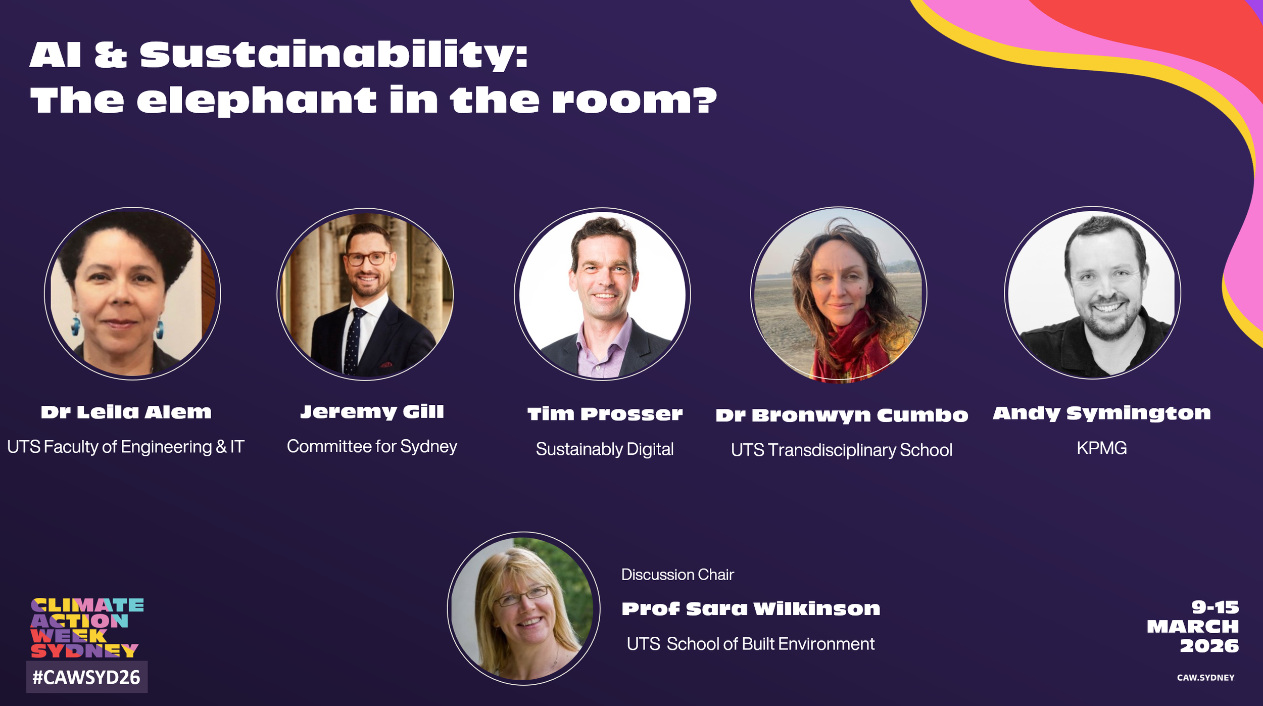 Last week I had the privilege of taking the stage at EnergyLab in Haymarket situated within the University of Technology Sydney (UTS) for a standout event during Climate Action Week Sydney 2026. The panel, expertly chaired by Professor Sara Wilkinson, tackled a provocative and timely theme: "AI & Sustainability: The elephant in the room?".