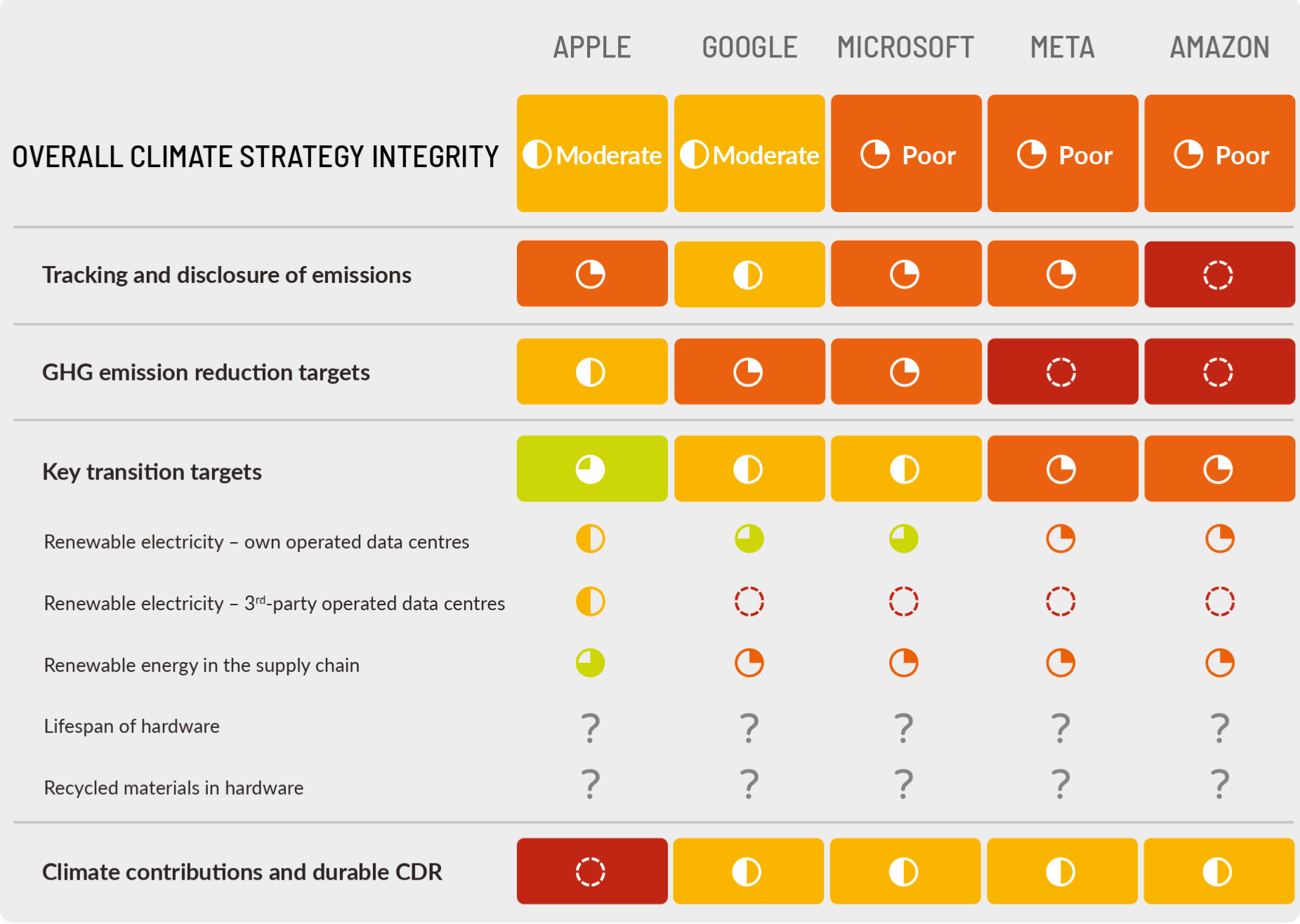 Furthermore, there is a significant lack of transparency regarding emissions from third-party operated data centres, which could represent a major accounting loophole. None of the major tech companies assessed report on the extent or emissions footprint of these outsourced services, obscuring a potentially large source of their climate impact.